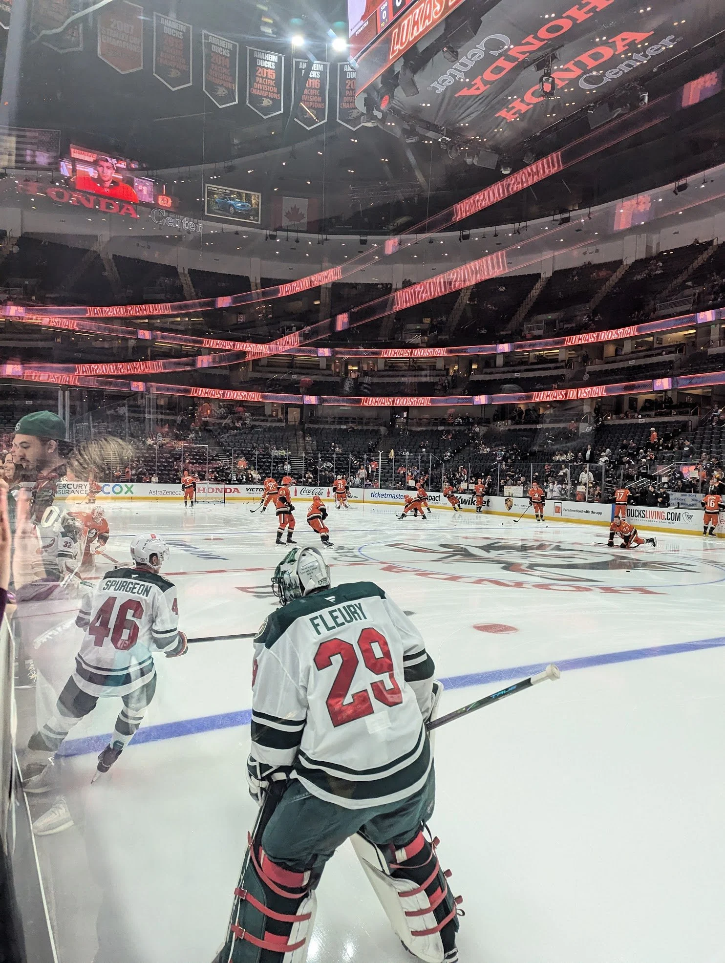 Pictured above: the players warming up at the Honda Centre, prior to the Ducks vs Wild game